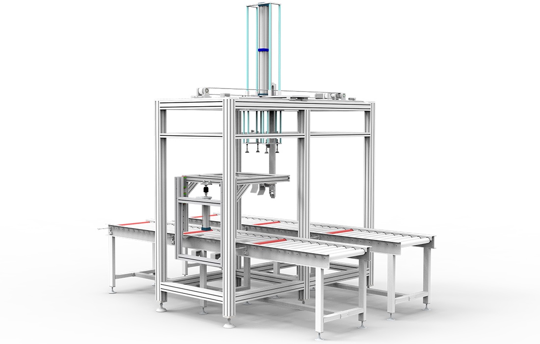自動放內襯機通過人工放內襯至軌道上并輸送至響應位置后,由多軸抓取裝置自動將內襯放置到紙箱中。